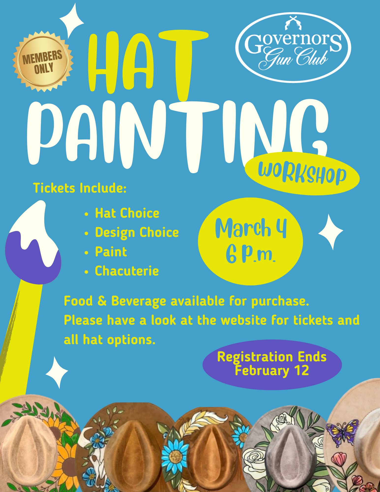 Sign up for our Ladies Night Hat Painting Class! Includes Class, Supplies, & Charcuterie. Food & Beverage available to order. Open to Members and their guests.