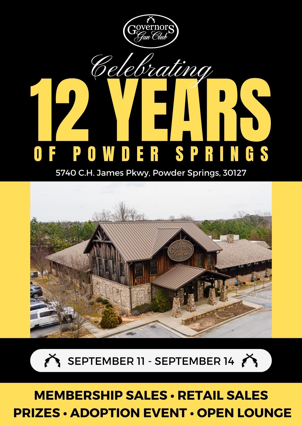 🎉 Celebrating 12 Years in Powder Springs! 🎉Join us September 11–14, 11 AM–8 PM daily for our 12th Anniversary Celebration at Governor’s Gun Club Powder Springs! ✅ Member-Only Deals on 9/11 – exclusive firearm & membership upgrade savings✅ Public Sales All Weekend – 12% off used guns, gear, classes & more✅ Membership Specials – big…