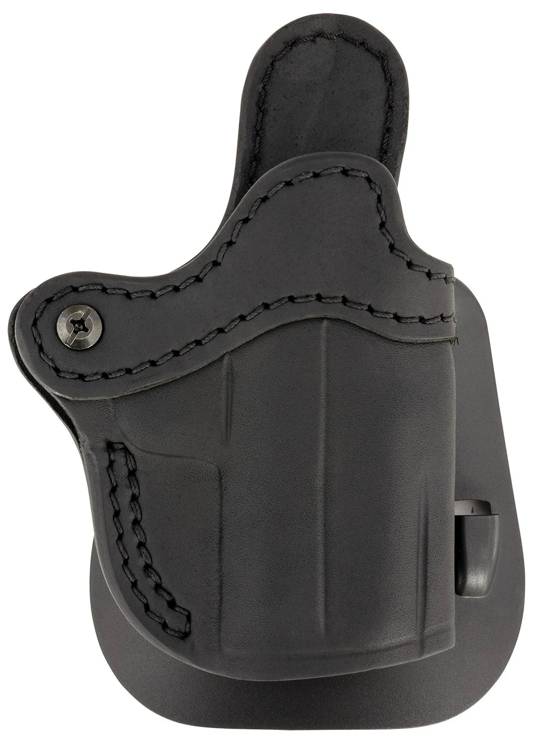 The Optic Ready Paddle Holster Compact is designed to accommodate Compact and Sub Compact firearms in the 2.5-to-3-barrel size range. Allows an Optic and the added paddle gives you great portability and a quick on and off. Additionally, the sweat guard will protect your gun from tarnishing and will act as a comfortable barrier between you and your hammer preventing any gouging into your side. This holster features an open top design for quick draw, reinforced stitching to ensure quality and security, and a multi-fit design that’s hand crafted to accommodate a wide range of firearms. It also includes an optic cut that accommodates most pistol optics. Compatible with 1911 3″; Bersa Thunder 380; Glock 42, 43, 43X; Kahr K9; Kimber 1911 3″, Micro 380, Micro 9, Ultra Carry; Ruger LC9, SR22; Sig Sauer P238, P365, Ultra Nitron; Springfield Hellcat; Taurus GX4; Walther PPK and similar frames.