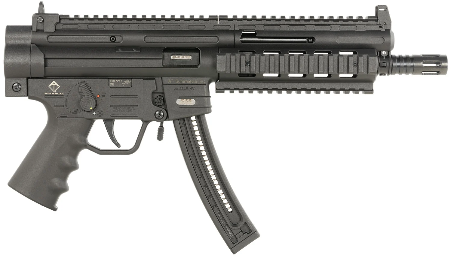 The ATI GSG (German Sports Guns) is a semi-auto rimfire rifle. Featuring a polymer grip and receiver; adjustable front and rear sights; synthetic collapsible stock with storage compartment; non-threaded barrel with a faux suppressor.