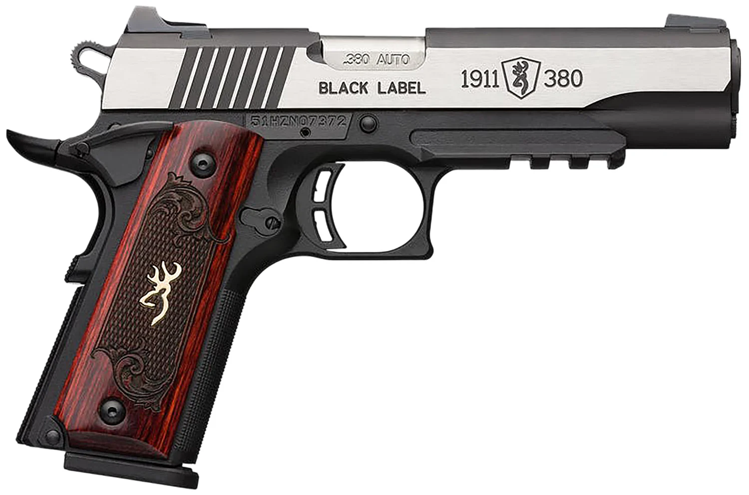 Browning 051969492 1911-380 Black Label Medallion Pro 380 ACP 4.25″ 8+1 Matte Black Stainless Steel with Black Accents Rosewood with Integrated Gold Buck Mark Inlay Grip Fixed 3-Dot Picatinny Rail