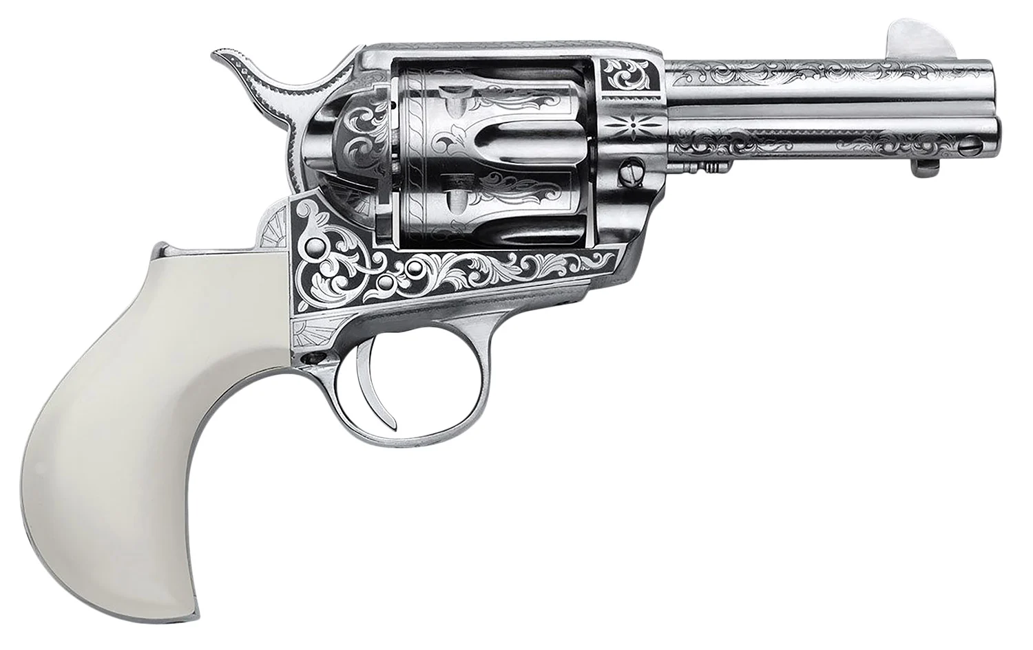 Cimarron PP346HUCKENG Huckleberry 45 Colt (LC) 6 Shot, 3.50″ Nickel Engraved Barrel, Cylinder & Frame, Poly-Ivory w/”Huckleberry” Engraved On The Backstrap Grip