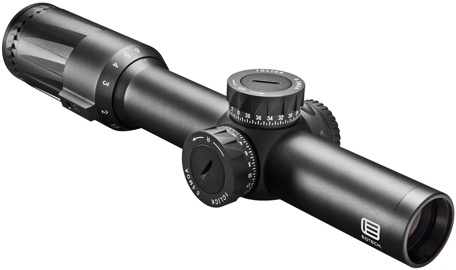 This is an optic that feels at home on the AR platform or on a bolt action rifle. The EOTECH Speed Ring reticle allows for fast target engagement at low power, but at higher power provides the resolution and accuracy required to tackle longer shots. The Vudu 1-6X is the perfect solution for short- to medium-range applications. Includes manual, throw lever, lens cleaning cloth and battery.