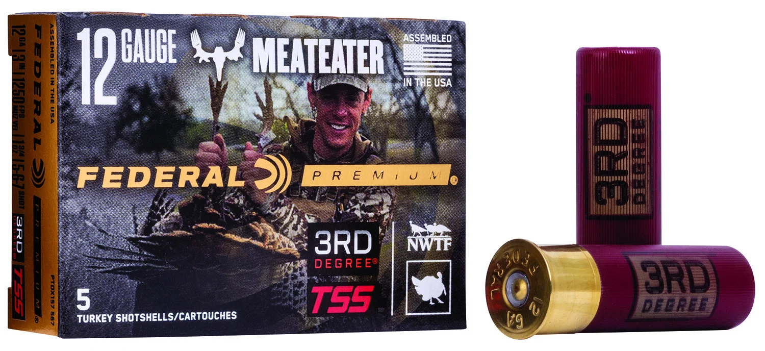 The Federal Premium loads start with the finest primers, which are subjected to more frequent inspections for dimensional tolerances and charge weight to ensure they deliver consistent ignition for every shot. Next is the propellants, which are specially formulated to meet Federal’s stringent specifications. These clean-burning powders are of the highest grades in the industry. They’re consistent and reliable. Rather than simply pattern tightly like conventional turkey loads, 3rd Degree uses a three-stage payload consisting of No. 5 copper-plated lead, No. 6 FLITESTOPPER lead, and 18 g/cc No. 7 HEAVYWEIGHT TSS shot to deliver larger, more forgiving patterns at close range, while still providing deadly penetration at long distance. Combined with the FLITECONTROL FLEX wad, it offers performance that’s made 3rd Degree the choice of MeatEater’s Steven Rinella.