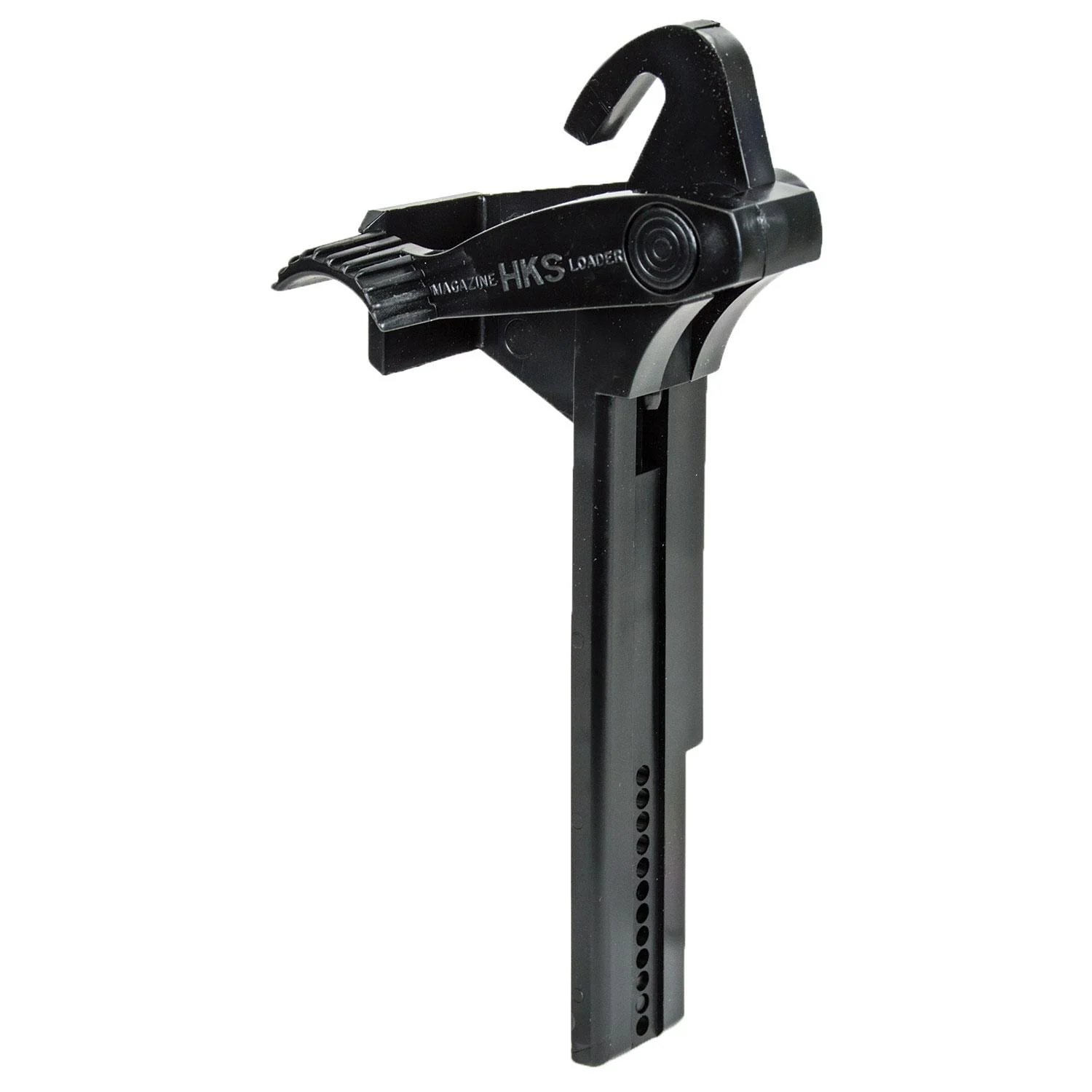 Thumb-operated lever arm is the secret to fast- easy operation. No sore fingers. No fatigue. Capable of loading 15 rounds in 18 seconds. Works equally well right or left handed. Faster and easier than ever before The HKS Magloader quickly loads double stack Glock and H&K magazines.