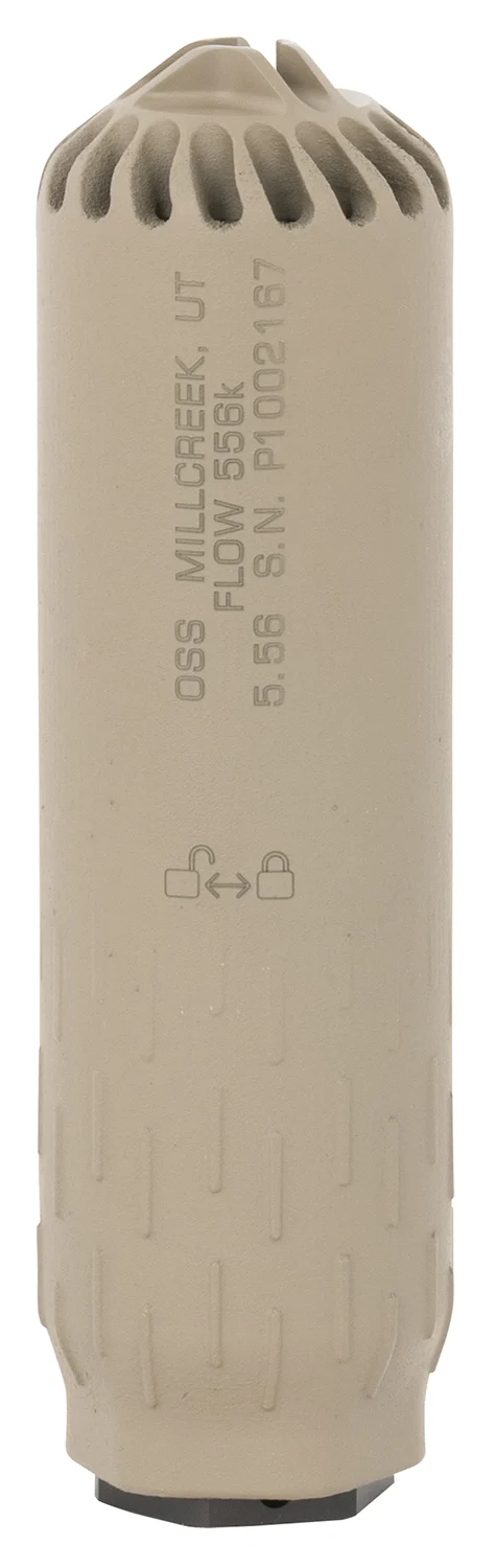 An innovative multi-caliber suppressor with patented and proven Flow-Through and Torque Lock technology. It is designed to reduce signature without negatively impacting cycling or service life. The FLOW 556k is DMLS printed in 17-4 Stainless. It delivers superior toxic fume exposure mitigation, flash reduction, sound reduction, recoil reduction, accuracy, and repeatability by its unique Flow-Through helical coil and core deflector design. It is full-auto rated and compatible on 5.56, 17 HMR, and 5.7 platforms. The integrated flash cap geometry effectively mitigates flash as part of its overall signature reduction functionality.