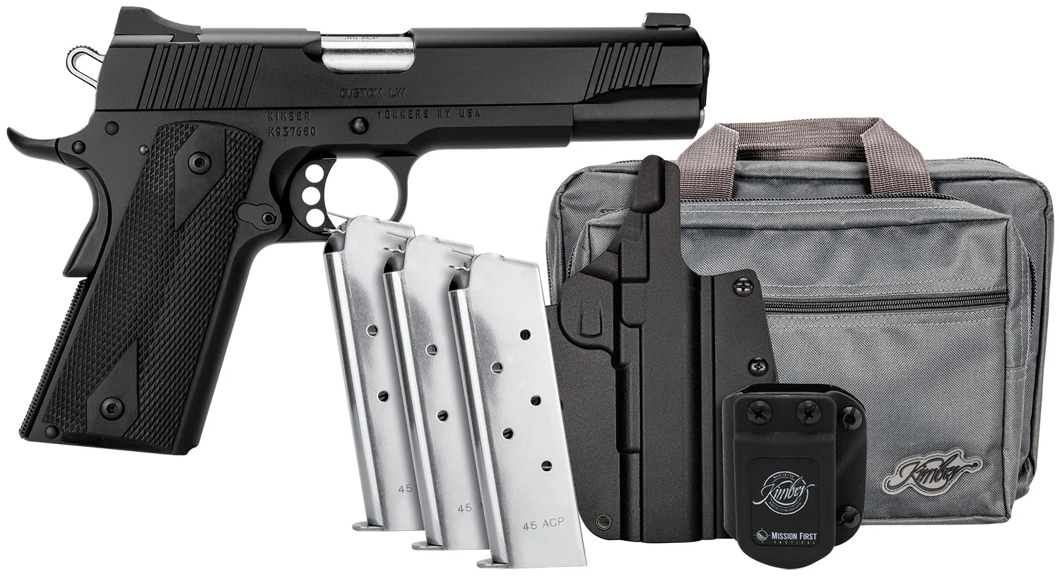 The Kimber Club Bundle (KCB) comes with three .45 ACP magazines, Mission First Tactical holster, Mission First Tactical magazine carries and Kimber Range bag.