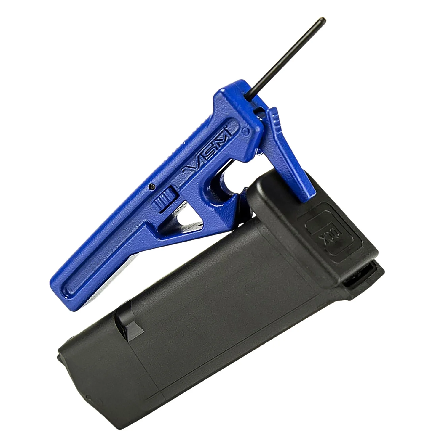 This pocket tool has 5 necessary tool elements for assembling and disassembling your Glock. A 3/32″ punch tool, 3/16″ hex nut driver, a MagPopper tool and a bottle opener. The corners of the tool handle are used for centering the frame pins in the frame. The pocket on the side of the tool acts as a third hand and holds the striker assembly while you disassemble it.