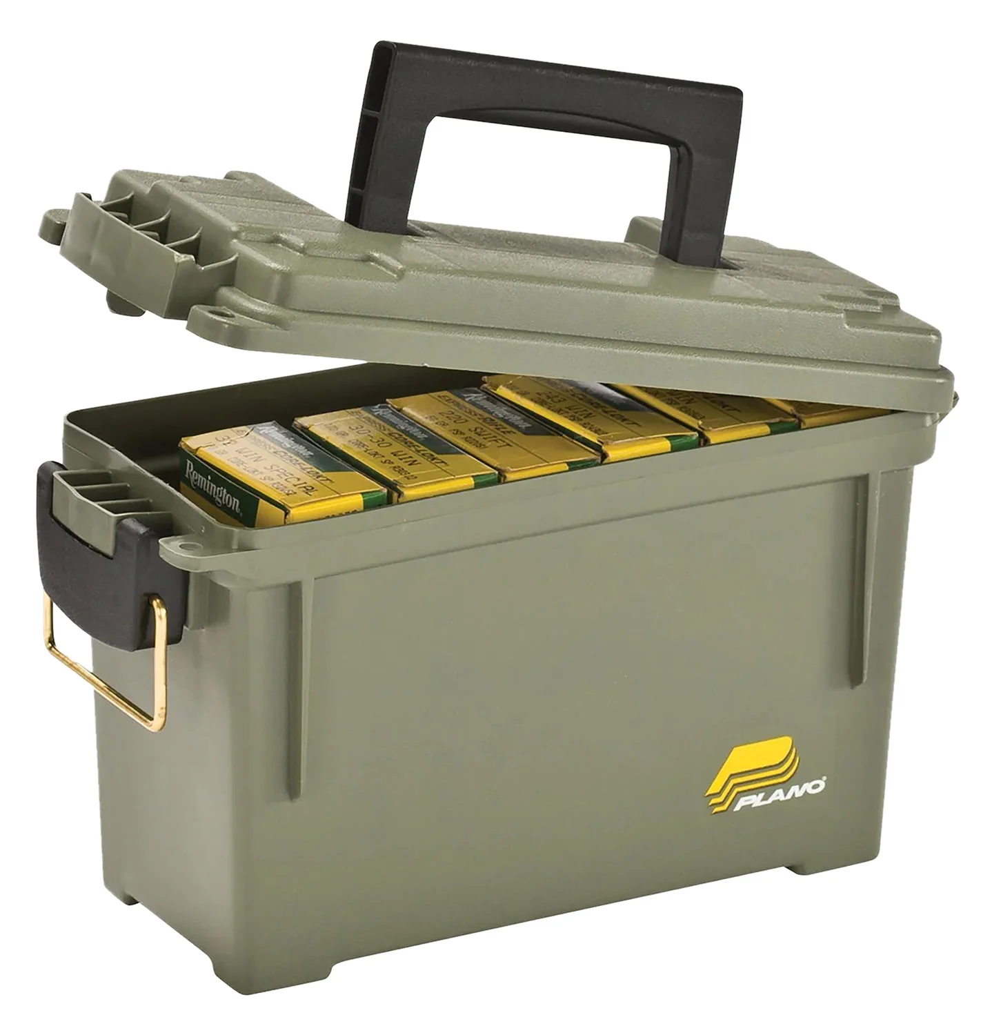 Plano’s Element Proof Field/Ammo Box is great for tools, electronics and other general storage. The box features a water-resistant O-ring seal to keep ammo dry and protected. The lid is firmly secured with a brass bailed latch and the heavy-duty handle allows for easy carry. It is constructed with durable, high quality plastic, ideal for 30 cal ammo and holds 6-8 boxes of ammunition.