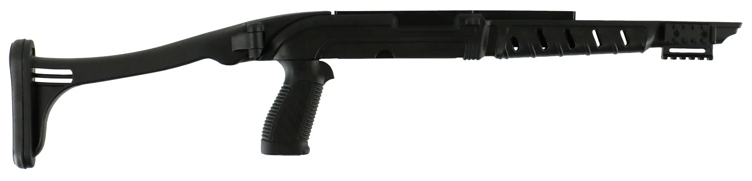 Made in the USA, this lightweight folding stock for the Mossberg 702 Plinkster .22 LR rifle features a pistol grip with storage compartment, Picatinny tri-rail forend, positive locking side folding stock with rubber recoil pad.