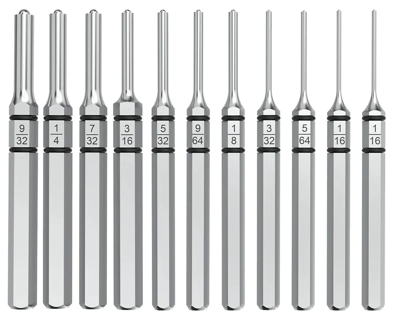 The Accu-Punch 11-Piece Roll Pin Punch Set is designed from the ground up to work better with firearms. The punches are made of hardened steel with a nickel plating to resist corrosion. The hex-shaped handle and rubber O-rings provide precise control during use.