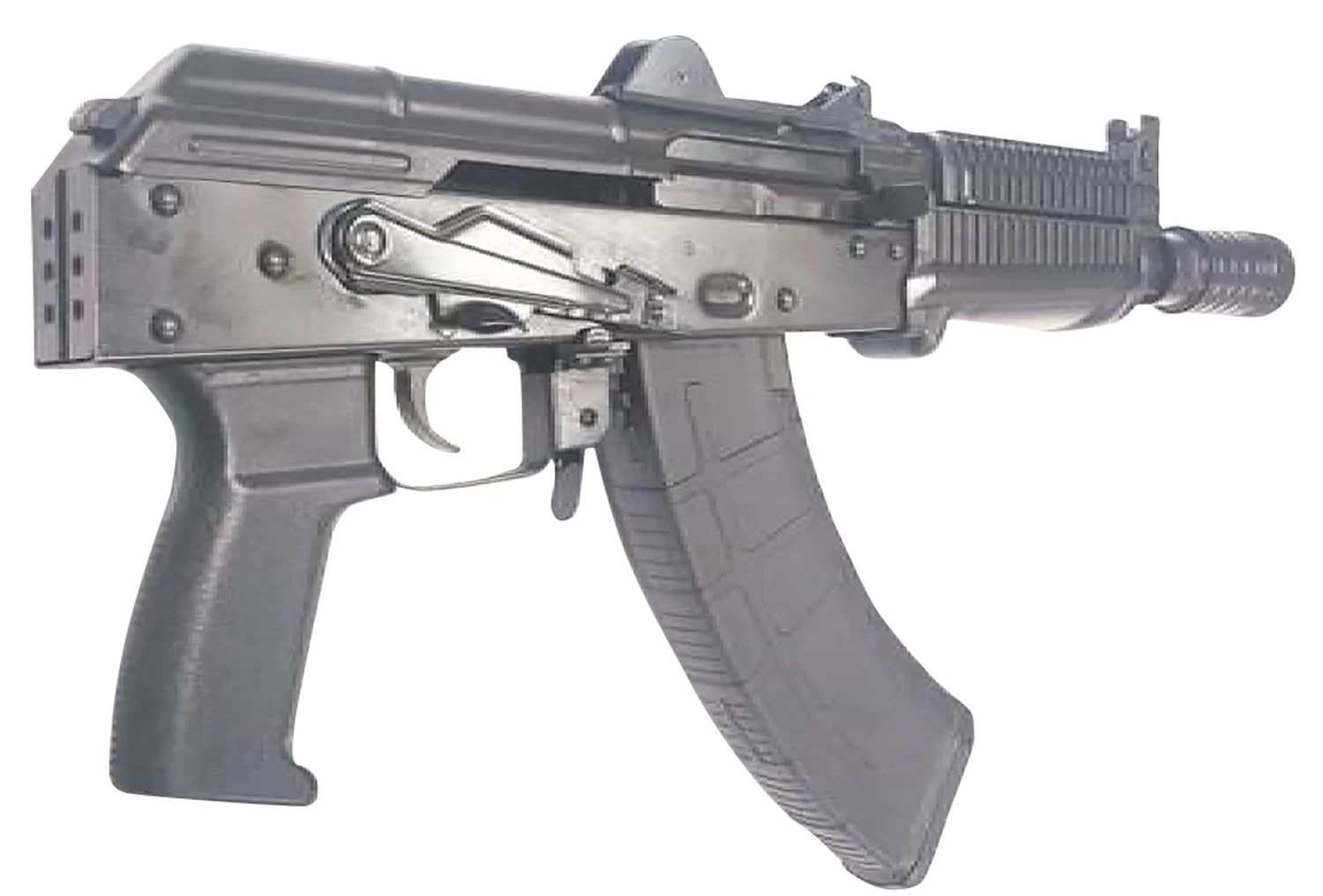 The pistol variant of the Krink. This model features a threaded (#10-32 screws); modular rear Trunnion that can accommodate a brace by using a pig-nose adapter; four piece muzzle brake with chrome-lined funnel; hinged dust cover; bolt hold open safety lever; machined scope mount side rail; lower handguard w/stainless steel heat shield; extended magazine release and gas block/front sight combo.