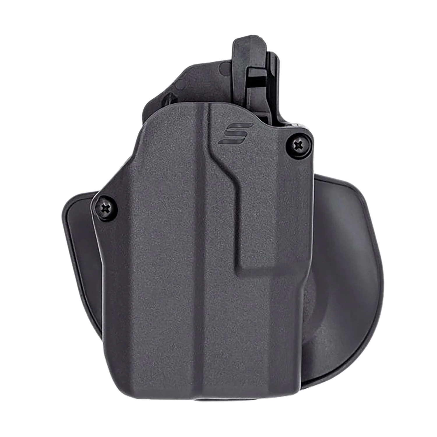 The Safariland Solis Holster combines the security of ALS with the release speed and draw simplicity of an open-top design. Solis is compatible with most compact red dot sights and subcompact lights. The ALS secures your firearm automatically as it is holstered, yet still allows a fast, natural draw with the swipe of the thumb release as you acquire your shooting grip. The Solis is built from durable, weather- and temperature resistant SafariSeven non-marking nylon blend.