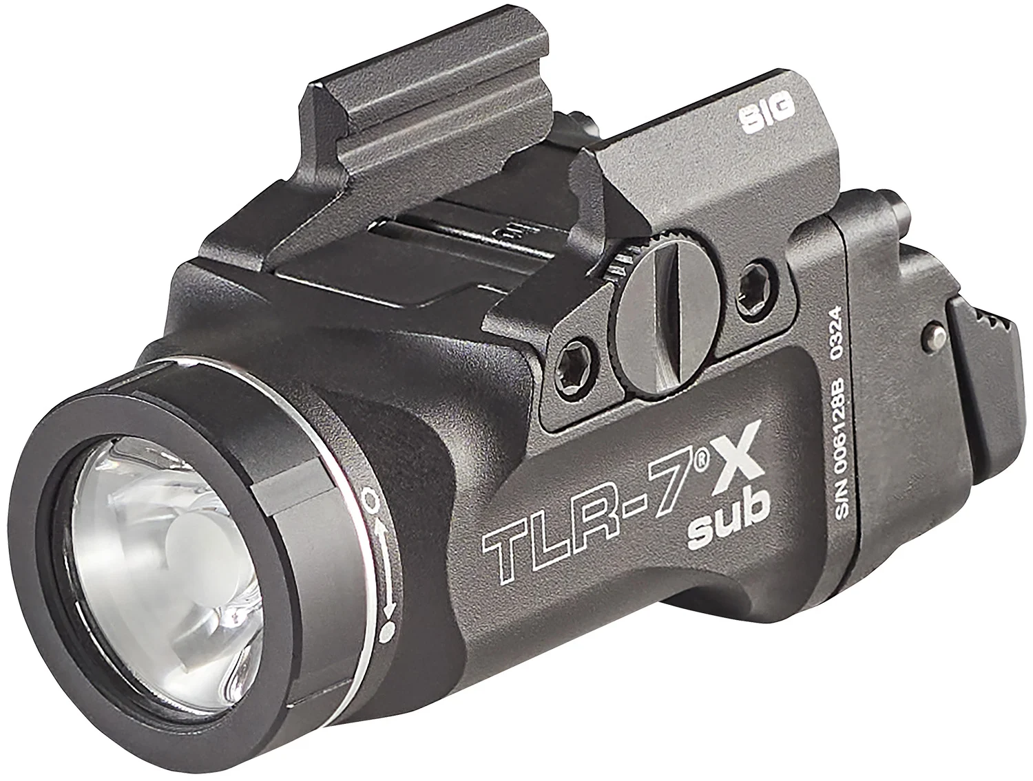 The TLR-7 X sub features multi-fuel battery capability powered by either one (1) CR123A or one (1)Streamlight SL-B9 lithium-ion rechargeable battery pack, both delivering 500 lumens and 5,000 candela. The integrated rail clamp is designed to rapidly attach/detach from the side of the weapon, providing smooth installation and removal without having to put your hands in front of the muzzle. Features a specialized clamp system for mounting on SIG SAUER P365/XL accessory rails. (Closed Rail Systems)