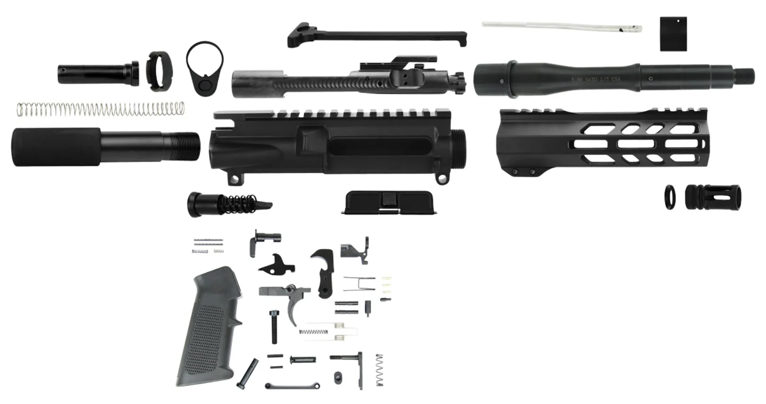 Tacfire’s AR Pistol Build Kit Includes: (1) 5.56x45mm NATO 7.5″ Barrel USA Made, (1) Bolt Carrier Group, (1) Mil-Spec Upper Receiver USA Made, (1) Slim Free Float MLOK Hand Guard 7″, (1) Complete Lower Parts Kit USA Made, (1) Standard Receiver End Plate, (1) Mil-Spec/Commercial Castle Nut/Steel, (1) Mil-Spec Pistol Buffer Tube/Alum. w/Foam Cover, (1) Heavy Buffer, (1) Buffer Tube Spring, (1) Mil-Spec Charging Handle, (1) Dust Cover, (1) Forward Assist, (1) Thread Flash Forwarder