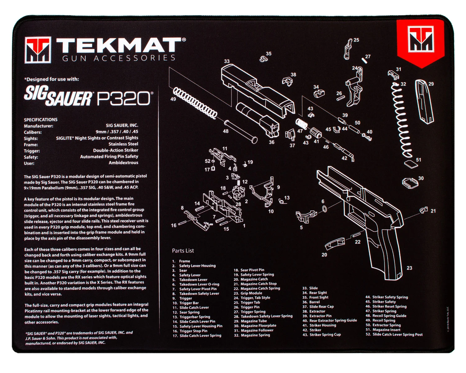 TekMat TEKR20SIGP320 Sig Sauer P320 Ultra 20 Cleaning Mat Black/White Rubber 15″x20″ Sig P320 Parts Diagram