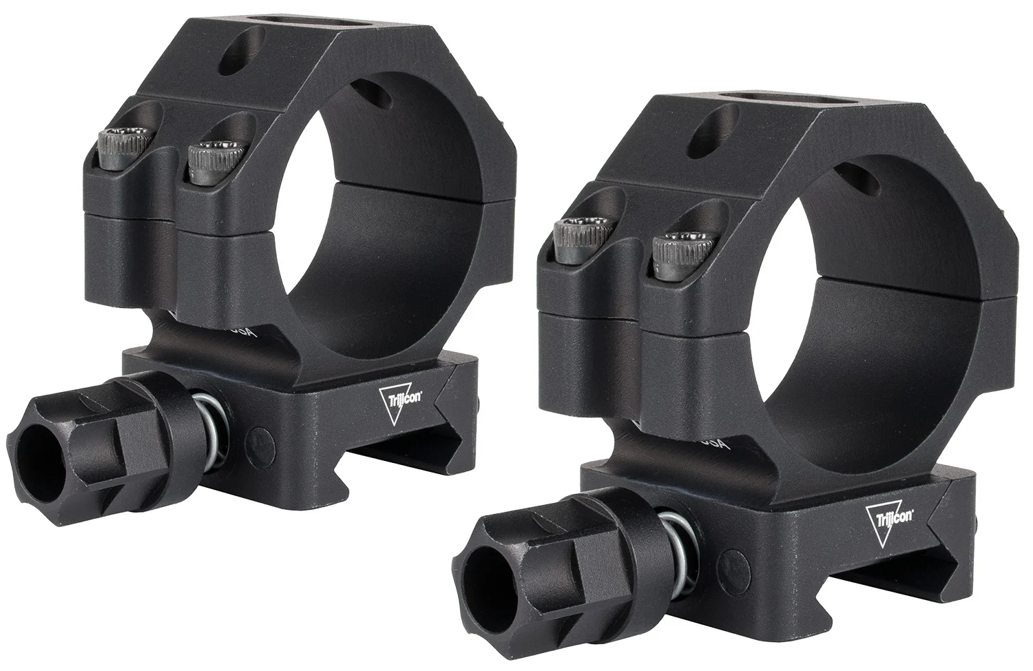 Trijicon Ring Mounts w/ Q-LOC Technology feature a 30mm tube, and are designed to keep the optic as low as possible for hunting and long range precision rifle applications. Featuring a Mil-Spec drop test rated 6061-T6 aluminum design and an easy to use one handed tool less mounting system. The spring-loaded design allows for constant retention and maintaining of zero even if the knobs are not tightened. The Ring mounts boast a low profile design with superior return to zero performance and are compatible with any Mil-Spec or NATO Picatinny rail. Designed specifically for variable power optics, these rings are perfect for mounting Trijicon variable power optics with an objective lens up to 40mm on any weapon platform with a full Picatinny rail.