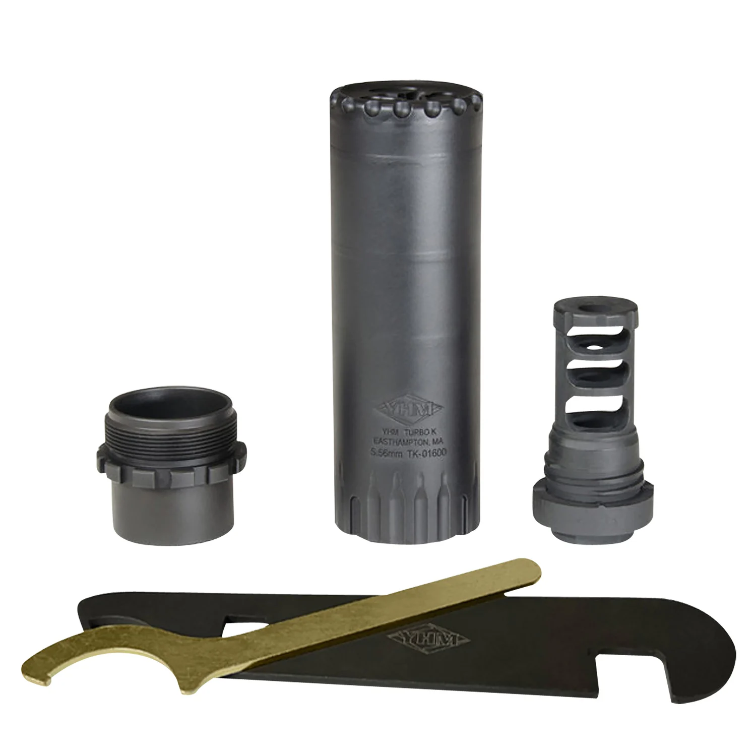 The Turbo K is getting the same treatment as its bigger brother the T3. This 5.56 NATO Suppressor features a design improvement to the baffles-resulting in reduced blowback-when compared to the previous model. The Turbo K-RB utilizes a tubeless design made from heat treated 17-4 stainless steel along with a heat treated 718 Inconel blast baffle. The combination of these materials allows the suppressor to be full auto rated and designed for rigorous use. The blast chamber of the Turbo K-RB is threaded to the popular 1.375-24 thread which allows it to utilize many available mounting options currently on the market. The notched rim and tri-port muzzle on the end cap make it stand out among the crowd. The overall length measures 4.9 and weighs in at 11.7oz. When using YHMs Phantom Q.D. adapter, the overall length is 5.5 and weights in at 12 oz. Having an average sound pressure level of 138dB on a 16 AR shooting 55 grain ammo, the Turbo K-RB is within the hearing safe threshold of 140 dB. The Turbo K-RB is built with the same care, quality, and attention to detail that has defined the YHM brand for generations. The Turbo K-RB ships with the Phantom Q.D. adapter, 2 suppressor wrenches and Q.D. flash hider. Minimum Barrel Lengths: 5.56 NATO: 10.5″ minimum barrel length